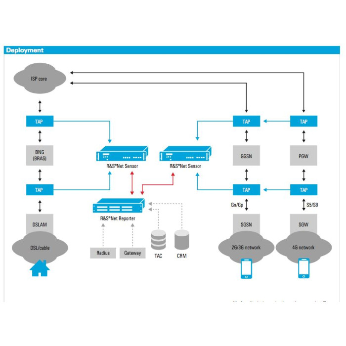 В типичном сценарии развертывания R&S Net Reporter 2 получает записи данных IP от множества зондов R&S Net Sensor, развернутых по всей сети, и автоматически агрегирует и сохраняет информацию классификации приложений. При подключении к дополнительным базам данных (абонентская база, CRM, TAC) классификация приложений дополняется дополнительной информацией, такой как абонент, устройство, местоположение и план данных. Простой в использовании, интуитивно понятный пользовательский интерфейс обеспечивает широкий спектр представлений, фильтрации и детализации параметров базовых данных.