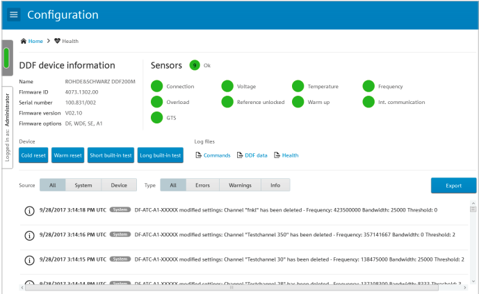 Общее состояние системы и системные сообщения доступны на всех графических интерфейсах оператора и пересылаются через интерфейс SNMP на центральную систему мониторинга, чтобы оперативно информировать администратора о проблеме. Консоль администратора R&S DF-ATC-S позволяет администратору выполнять дополнительные процедуры самотетсирования и полать более детальную информацию о результатах теста.