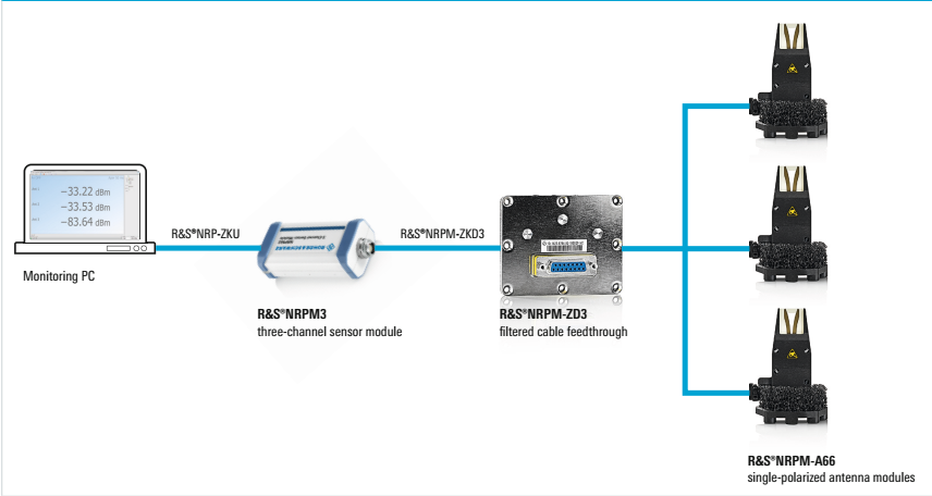 Трехканальный сенсорный модуль R&S NRPM3 обрабатывает измеренные значения даже от трех антенных модулей по трем отдельным каналам. Если нужно больше трех антенных модулей, можно добавить дополнительные сенсорные модули. R&S NRPM3 подключается к управляющему компьютеру с помощью интерфейсного USB кабеля R&S NRP-ZKU.