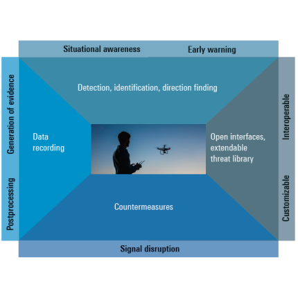 - Охватывает все возможности обнаружения, пеленгации и предоставление контмер для радиоуправляемых беспилотников (R&S®ARDRONIS-I/-D/-R)