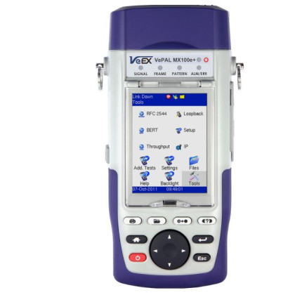 VePAL MX100e + является простой версией в серии семейства портативных тестеров Ethernet MX100+ который является широко распространенным классом в своей области. MX100e+ опирается на успех MX100+. В нем добавлены новые решения для приложений, таких как, например МСЭ Y. 1564 и проверка OAM Ethernet, V-SAM, реализация компанией VeEX стандарта ITU-T Y.1564, - это интуитивно понятный автоматизированный набор тестов. Он обеспечивает проверку Ethernet трафика, который транспортируется по мобильным сетям Backhaul и Carrier Ethernet, путем оценки pass/fail limits. Тестирование OAM поддерживает новые функции, включая IEEE 802.3ah, IEEE 802.1ag, и ITU-T Y.1731 OAM протоколов связи и сервиса, которые разработаны для диагностики и устранения проблем в сетях Carrier Ethernet. Уровень связи OAM тестирование включает в себя обнаружение партнерского связи, удаленная обратная петля, поиск MIB и уведомление о событиях соединения. В то время генерация трафика и анализ непрерывной проверки, обратной петли и собщения и облегчает сервисное обслуживание тестовых приложений OAM. Показатели производительности метрики вследствии задержки и потери кадров а также подерживаются посредством OAM ITU-T Y.1731. MX100e+ поддерживает интерфейсы: 10/10/1000Base-T, 1000Base-X, и 100Base-FX. Кроме этого, тестер поддерживает RFC2544, многопотоковость, Q-in-Q, MAC и VLAN флудинг. Благодаря доступному набору тестов, MX100e + идеально подходит для инженеров, которые занимаются установкой, вводом в эксплуатацию и обслуживанием сетей Carrier Ethernet и Mobile Backhaul.