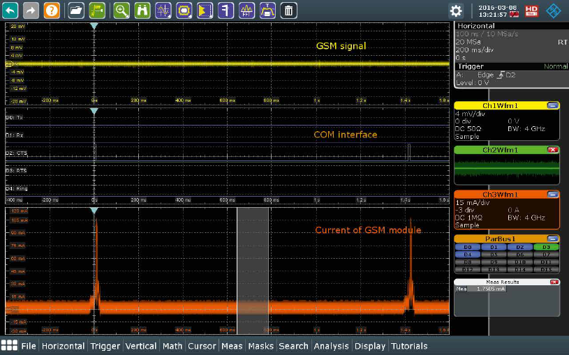 Несмотря на свою мощность и диапазон функций, R&S®RTO2000 остаётся чрезвычайно простым в использовании благодаря своему качественному 12.1" сенсорному экрану. Функция R&S®SmartGrid гарантирует, что все сигналы и другая информация чётко и понятно отображаются. Важные инструменты, такие как курсоры, измерения и отмена/повтор (undo/redo) находятся на панели быстрого доступа. Раздел приложений обеспечивает доступ к таким приложениям, как функции запуска (triggering) и декодирования сигналов, согласование и испытание целостности сигнала, анализатор I/Q – данных и даже изготовленные по техническим условиям заказчика средства разработки. R&S®RTO упрощает документирование измерений. Скриншоты, формы сигналов, события и инструменты конфигурации могут быть сохранены простым нажатием кнопки. Использование аналогового канала для выполнения измерения тока обеспечивает фиксированное время для других измеряемых сигналов. Рис. 5. показывает пример измерения тока в канале 3 (оражневый), измерение тока в 1,7 мА в течении последовательности засыпания (sleep sequence). Потребление тока коррелирует с выходным радиосигналом на канале 1(жёлтый) и активности системы на границе раздела UART(универсальный асинхронный приемопередатчик) интерфейса. Находясь в режиме покоя, модуль не передаёт никаких радиосигналов, но он принимает регулярные сигналы поискового вызова от базовой станции. Потребление тока кратковременно возрастает до 105 мА, а модуль передаёт UART-кодированный сигнал связи на свободной для передачи линии (CTS), который получен с помощью цифрового сигнала.