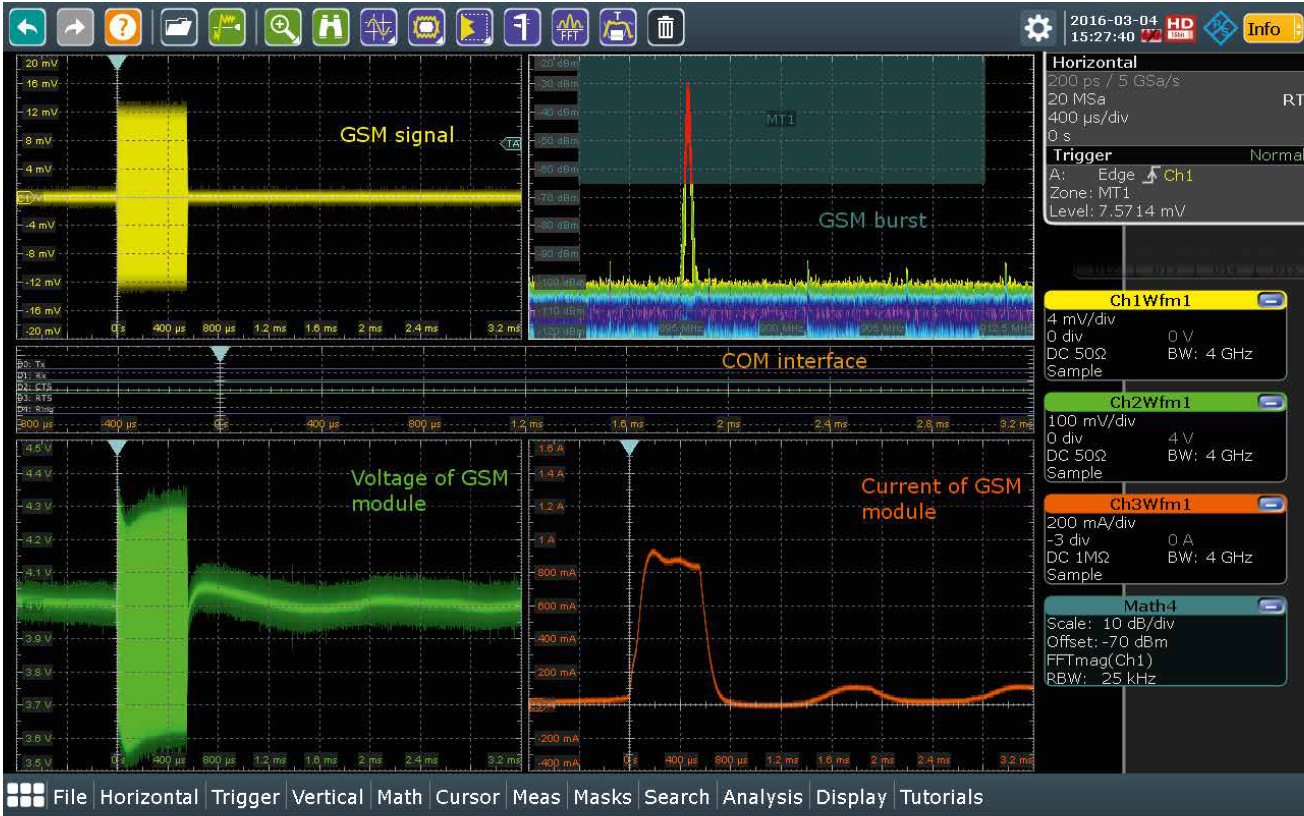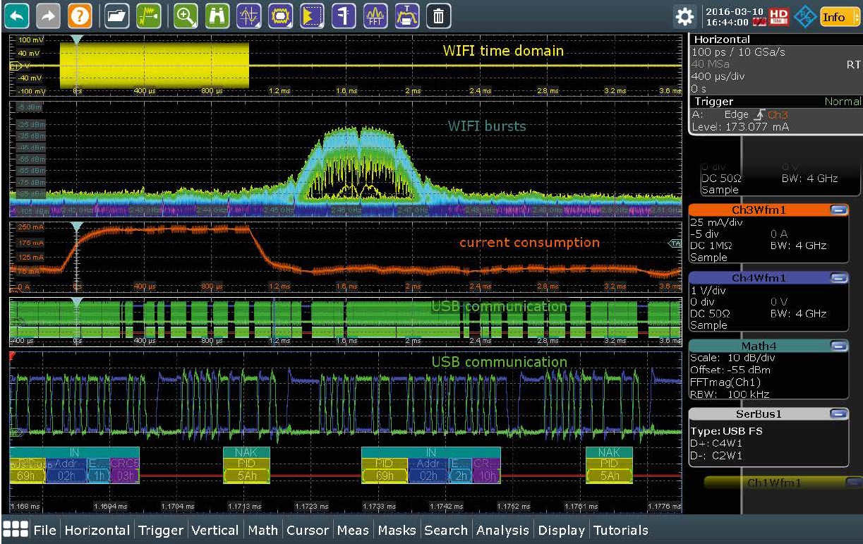 Рис. 3 показывает различные варианты измерений в качестве приложений Интернет вещей (IoT) с радио модулем Wi-Fi. Канал 1 (жёлтый) приобретает сигнал Wi-Fi и показывает его во временной области. Однако, форма сигнала не полностью узнаваемая, пока сигнал не будет показан в спектре (Math4). Канал 3 (оранжевый) показывает, как влияет на радиосигнал ток потребления. Выбор времени управления USB-интерфейсом также показан. R&S®RTO-K 60 опция декодирует сигналы, полученные по каналам 2 и 4 (зелёный и синий) в читаемую USB-информацию.