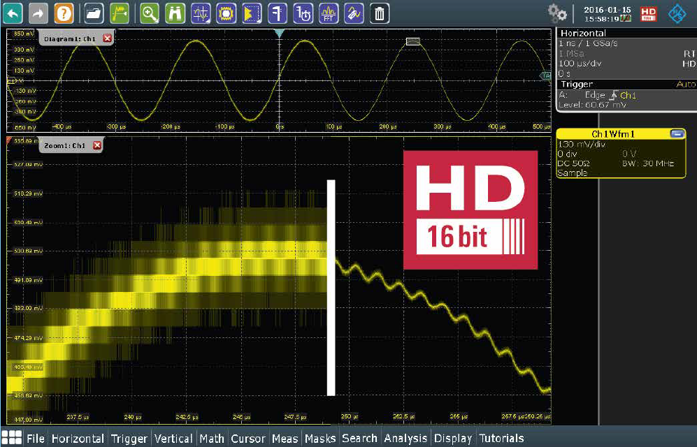 R&S®RTO2000 обеспечивает высокий уровень чувствительности и динамический диапазон. Это возможно благодаря малошумящим фронтам и патентованным 10 ГГц-овым одноядерным аналогово-цифровым преобразователям. Минимальный эффективный шум < 100 мкВ, более семи эффективных бит (ENOB), а так же выделение канала к каналу > 60 дБ являются всего лишь несколькими примерами. Такие характеристики делают аналоговые каналы идеальными для анализа и измерений в частотной и временной области. Исследование деталей сигнала часто требует более высокого разрешения по вертикали. Разрешение R&S®RTO2000 достигает 16 бит и высокой чёткости в режиме (HD). В режиме HD, high-quality (высокое качество), регулируемые фильтры низких частот (ФНЧ) по направлению выходного ключевого блока аналогово-цифрового преобразователя ограничивает ширину полосы пропускания сигнала (Рис. 4.). Пользователь может выбрать подходящую комбинацию разрешающей способности и ширины полосы пропускания. Даже система цифрового запуска извлекает выгоду из высокого разрешения в режиме HD и может инициировать мельчайшие детали сигнала. Осциллограф предоставляет не только высокоэффективную обработку аналоговых сигналов. Он так же имеет мощную цифровую обработку сигнала, основанную на запатентованной технологии ASIC. Это быстрая параллельная обработка сигнала, которая явно превосходит внешний ПК на основе постобработки сигнала. R&S®RTO2000 получает, обрабатывает и отображает до 1 миллиона осциллограмм в секунду, даже когда гистограммы, маски или измерения с помощью курсора происходят в реальном времени. Эта возможность является уникальной для лабораторного класса осциллографов. Так же она является ключом к быстрому и успешному детектированию случайных ошибок или случайных погрешностей. Полученная память может быть расширена до 2 Гигасэмплов (Gsample), что так же уникально для этого класса приборов.