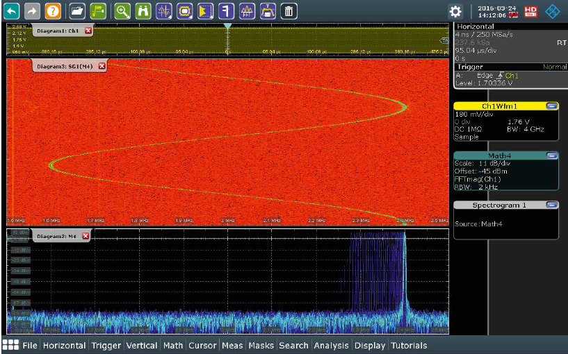 Мощная функция спектрального анализа, базированная на FFT (быстрое преобразование Фурье, БПФ), на всех аналоговых каналах R&S RTO2000 открывает дополнительные возможности. Например, можно анализировать радиосигналы, производить отладку EMI (радиопомех) для того, чтобы найти помехи в спектре или при спектральном анализе сигналов источников питания. В отличии от традиционной реализации БПФ в осциллографах, осциллограф RTO2000 от Rohde & Schwarz позволяет получить более высокое разрешения и более высокую скорость отображения с его цифровым понижающим преобразователем данных (DDC), в котором вычисление БПФ может быть ограничено до выбранного диапазона частот. Удобные функции такие, как автоматизированные измерения, список амплитуд, детекторы захвата максимума и маски тестов поддерживают отладку в спектре. Одной из уникальных характеристик является: спектрограмма, которая визуализирует изменения частотных компонент на протяжении всего времени (Рис. 6.).